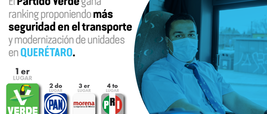 Partido verde lanzó las mejores propuestas para mejorar el transporte público en Querétaro Primer lugar: Aumento en la seguridad del transporte público / Modernización de las unidades de transporte público en la ciudad (Partido Verde)Segundo lugar: Instalación se cámaras de seguridad (PAN)Tercer lugar: Medios de transporte alternativo (MORENA)Cuarto lugar: Cambiar las rutas a lugares transitados […]