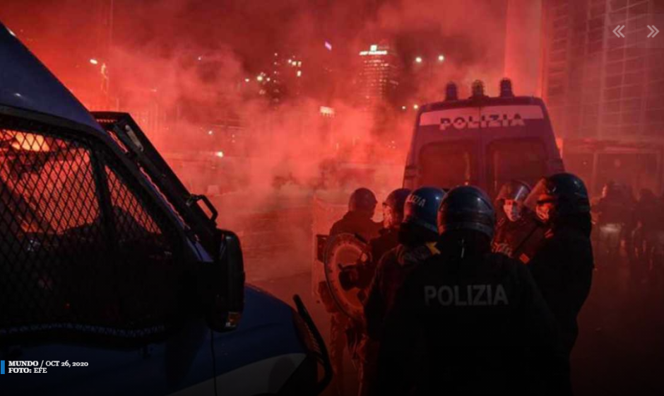 Roma.- Numerosas manifestaciones de protesta se han producido en varias ciudades de Italia contra el decreto del Gobierno para frenar los contagios por coronavirus, que prevé el cierre de algunas actividades y de los bares y restaurantes a las 18:00 horas, y que algunas han degenerado en enfrentamientos con la policía y actos vandálicos.