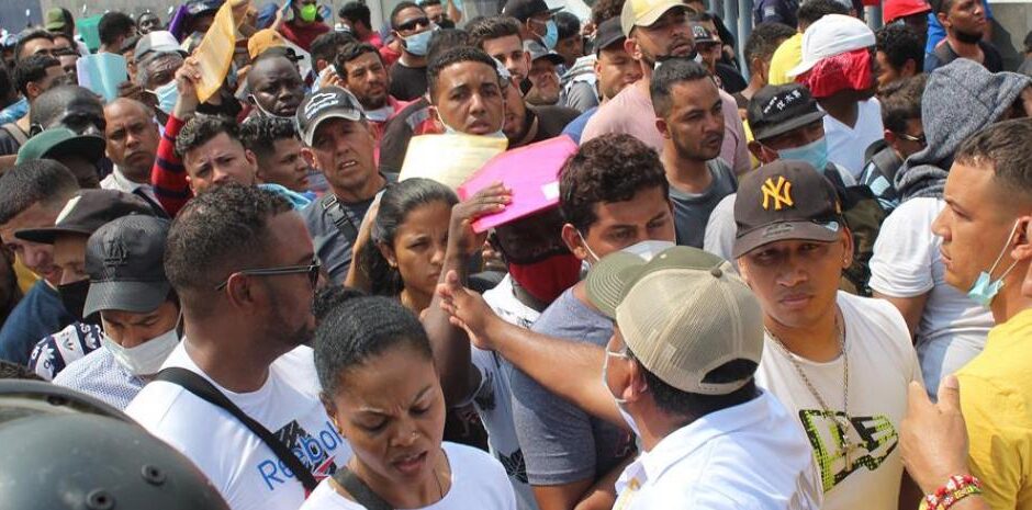 «Al grito de fuera, fuera» y «hagan fila», un grupo de migrantes de origen latinoamericano pidió a los africanos y haitianos que se retiraran de la puerta principal, pero muchos de ellos ignoraron el llamado.