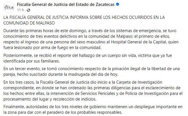 La Fiscalía General de Justicia del Estado de Zacatecas informó de tres hechos violentos en diferentes puntos del municipio de Villanueva, en la comunidad de Malpaso.