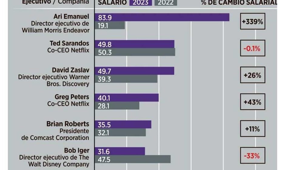 Según Hollywood Reporter, muchos jefes de gigantes del entretenimiento vieron aumentar sus retribuciones, mientras que otros, como Bob Bakish, recién sustituido en el cargo de Consejero Delegado de Paramount Global, y Ted Sarandos, de Netflix, experimentaron caídas mínimas. Al fin y al cabo, los sueldos de los ejecutivos suelen estar dominados por las acciones y las opciones.