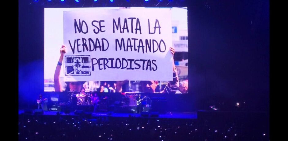 “Hay gente que por hacer su trabajo en este país ha sido asesinada, quienes están dando su vida para que nosotros sepamos lo que está pasando en este país están siendo asesinados. Esta canción va para todos nuestros reporteros que brutalmente y estúpidamente han sido asesinados por su libertad de expresión”, expresó.