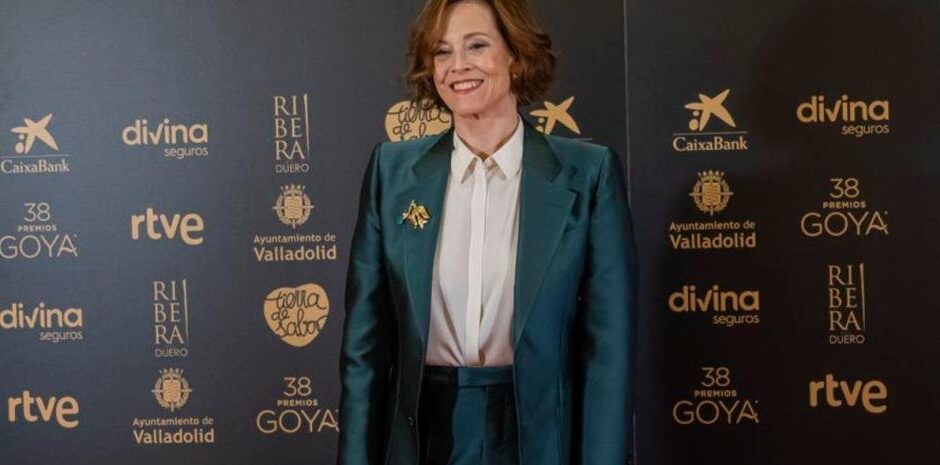 Elegantemente vestida con un traje chaqueta verde botella, con un llamativo broche en la solapa y camisa blanca, optó por unos zapatos totalmente planos, a pesar de lo cual sobresalía al posar para las fotos entre el presidente de la Academia del cine español, Fernando Méndez Leite, y el alcalde de Valladolid -ciudad que acoge la gala-, Jesús Julio Carnero, desde sus 183 centímetros de altura.