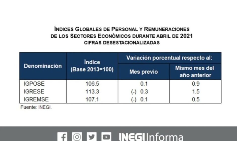 Por su parte, el índice global de remuneraciones de los sectores económicos (Igrese) alcanzó un nivel de 113.3 puntos en el mes de referencia, registrando una disminución de 0.3 por ciento respecto a marzo y un incremento de 1.5 por ciento con relación a abril del año pasado, con cifras desestacionalizadas.